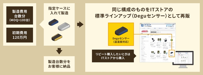 また、Degu量産設計サービスでは、サービスを通じて再設計した内容を再販する、独自のシェア型料金体系を採用していることも特徴のひとつです。コアスタッフは、あるお客様から依頼された内容について、そのお客様への納入後に同様の構成で一般向け製品としてパッケージ化し、コアスタッフのオンラインショップで販売します。一度設計された内容をオープンにしシェアすることで、簡単に使えるDeguセンサーのラインアップを拡大し、IoT全体の発展を目指します。お客様も再販を許可する代わりに安価な初期費用で量産設計を依頼できるメリットがあります。再販を希望しないお客様向けには、設計データを買い取れるオプションサービスも用意します。