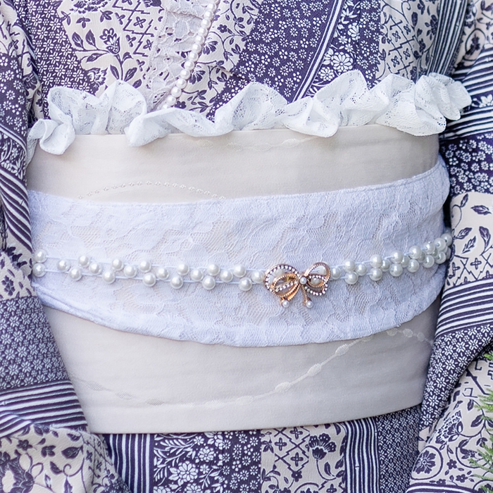 半幅帯、帯の前には飾りひも、後ろにはレースの帯花飾りがセットとなっており華やかさが倍増しますので、どこから見てもかわいい仕上りとなっております。