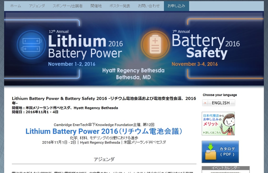 会議:「Lithium Battery Power & Battery Safety 2016 -リチウム電池会議および電池安全性会議 2016年」