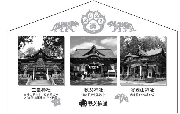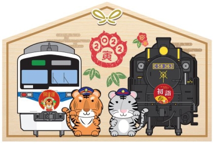 2022年干支の『寅』をモチーフにした、カラー硬券入場券です。硬券の裏面には、お願い事が書けるようになっています。また、台紙は絵馬型になっており、表面には急行開運号のイラストがデザインされ、裏面には秩父三社を紹介しています。