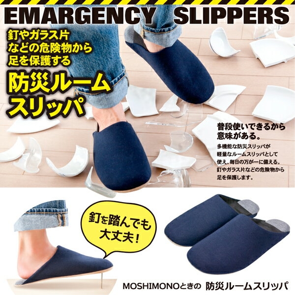 床に落ちたガラス片などからを足元をいざというときに守る防災ルームシューズです。