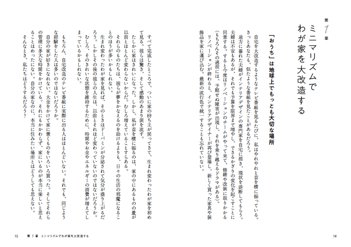 これは単なる片づけの本ではない。 それぞれの部屋が何のためにあるのかを思い出し、わが家を地球上でいちばん大切な場所だと感じられるようになることが目的だ。