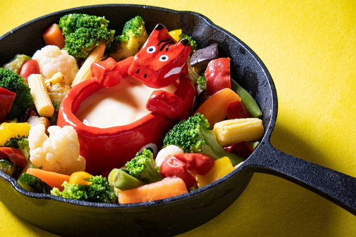 ビアガーデンのおつまみももちろんベコジェニックな見た目にこだわっています。今年は新たに「赤べこチーズフォンデュ」が新登場します。赤べこの形をした器に入ったチーズを温め、野菜に付けて食べる1品です。その他にも、赤べこがナッツを背負っているおつまみなど、ビールに合うかわいい見た目のおつまみを提供します。