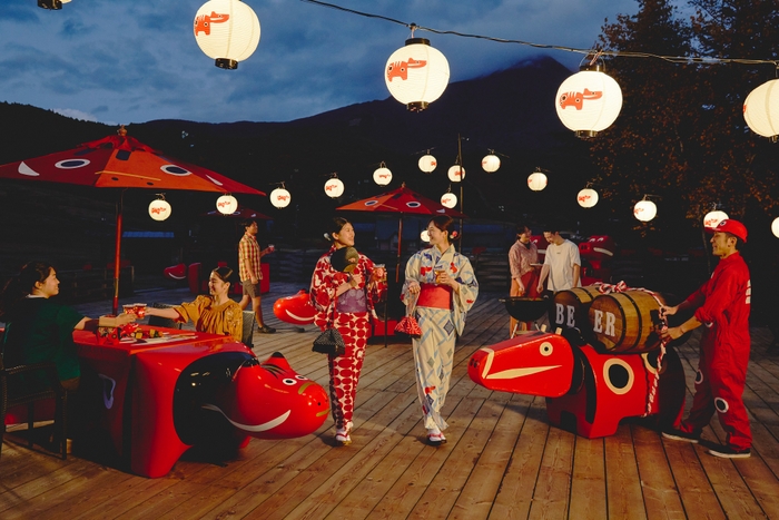 磐梯(ばんだい)山麓に位置するリゾートホテル「星野リゾート 磐梯山温泉ホテル」では、2023年7月8日~8月31日の期間、会津の郷土玩具「赤べこ」をテーマにしたベコジェニックな「赤べこビアガーデン」を開催します。日本百名山の磐梯山麓に広がる雄大な自然の中、会場の装飾からスタッフの衣装、おつまみの器に至るまで赤べこに囲まれた、フォトジェニックならぬ「べこジェニック」なビアガーデンです。今年は、新たに長さ1.5mの巨大赤べこビアサーバーが登場します。さらに、フードメニューには「赤べこチーズフォンデュ」が加わり、パワーアップ。赤べこ型の器に入ったチーズを温めて食べる見た目も楽しい1品です。また、赤べこ柄の浴衣の貸出も行い、かわいく、おいしく、夏の宵を楽しめます。