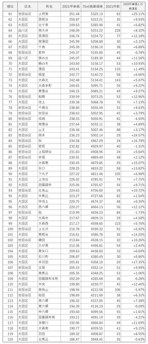 ・ランキング対象の全120町名のうち、前年より価格が上昇した町名は104ヶ所。約87%の町名で、コロナ禍でも価格上昇した2020年より、さらに坪単価が上昇している。