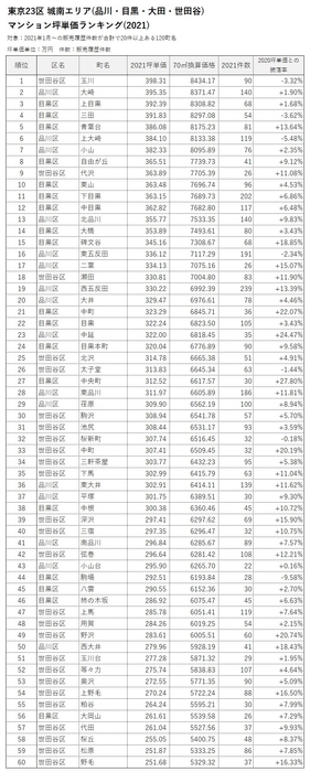 「マンションレビュー」のデータで見る「東京23区のマンション相場変遷10年」 城南エリアでの町名ランキングを発表!