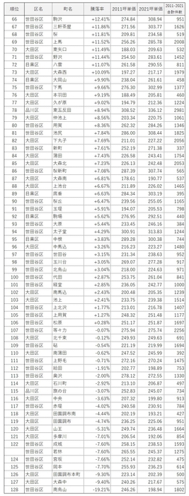 2011年と2021年のマンション坪単価より騰落率を算出。