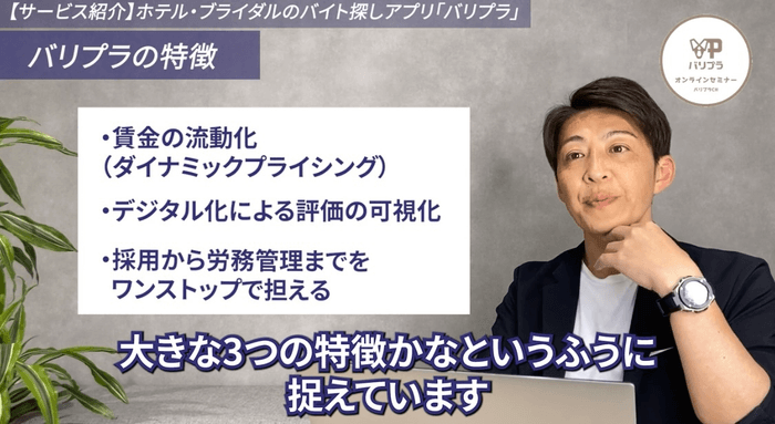 内容:ホテル・ブライダル業界特化のアルバイト探しアプリ「バリプラ」の誕生背景や特徴、メリットなどをインタビュー形式で回答しています。