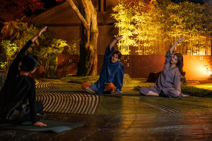 おやすみ前には、星のや京都の奥の庭で、呼吸法を重視したストレッチと瞑想を取り入れた「夏夜の深呼吸」を行います。四肢を伸ばし、呼吸を調えるストレッチです。庭の青もみじの下で、渓谷に吹く風を感じながら過ごすひとときは、夏の暑さで疲れた身体をほぐし、心地よい眠りへ導きます。