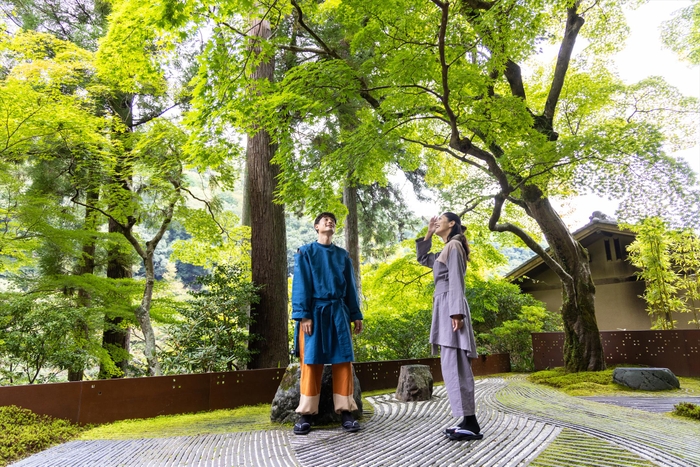 チェックインの後には、特別に仕立てた滞在着に着替えます。滞在着は平安貴族が着用していた和装をモチーフとしたものです。チェックアウトまで特別な滞在着を纏(まと)うことで、平安貴族さながらに優雅に過ごすことができます。