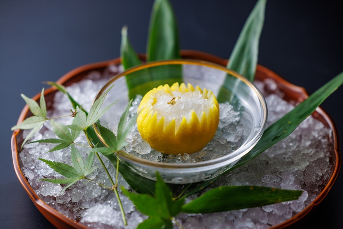 チェックインの後、ウェルカムスイーツとして日本酒と柚子サイダーで作ったシャーベットを用意します。柚子サイダーは京都の水尾の柚子を使用したもので、すっきりとした風味が特徴です。青もみじが光を柔らかく遮る納涼床でひんやりとしたシャーベットを味わい、涼しいひとときを過ごします。