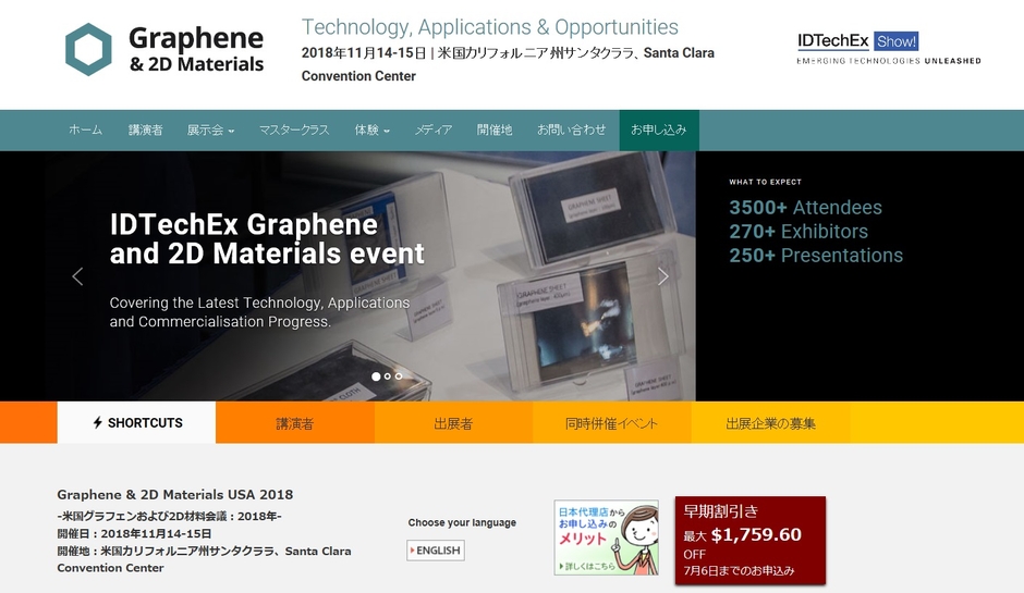 国際会議 「米国グラフェンおよび2D材料会議 2018年」(IDTechEx Ltd.主催)の参加お申込み受付開始