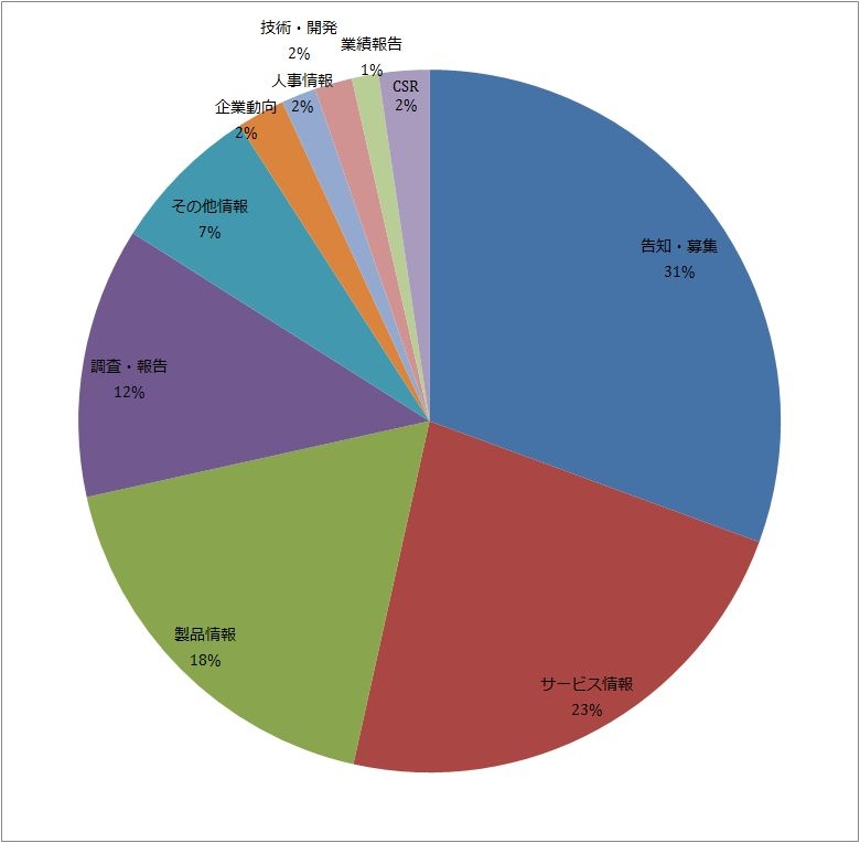 情報カテゴリー別の内訳は、「告知・募集」31%、「サービス情報」23%、「製品情報」18%、「調査・報告」12%、「その他情報」7%、「CSR」2%、「企業動向」2%、「人事情報」2%、「技術・開発」2%、「業績報告」1%となっています。