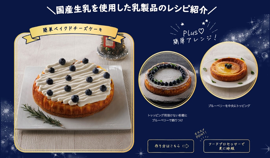 Webサイト「MERRY TASTY CHRISTMAS」では、クリスマスの食卓を華やかに彩るレシピを特集しています。「おうちで手軽に楽しむクリスマス!」をテーマに、国産生乳を使用した乳製品を使って手軽に作れる3種のケーキレシピとデコレーションアレンジや、パーティーにおすすめのおしゃれなメニューなどをご紹介しています。大切な方との特別なひとときに、ぜひお役立てください。