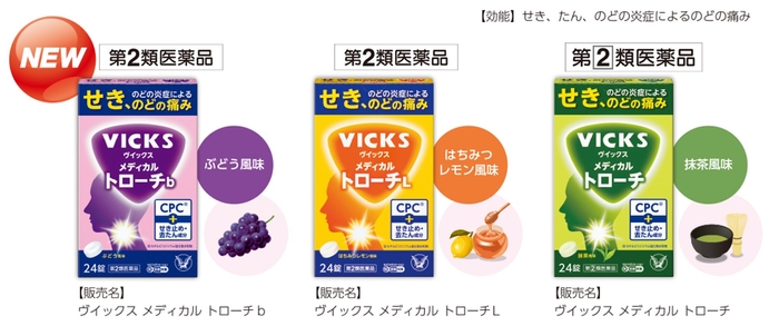 「ヴイックス メディカル トローチb」は、殺菌成分CPC(セチルピリジニウム塩化物水和物)、せき止め成分、去たん成分を配合し、せき、たん、のどの炎症によるのどの痛みなどの症状に効果があり、水なしで服用可能なので外出時やお仕事中にもおすすめです。このたび、既発売のはちみつレモン風味、抹茶風味に加え、有効成分独特の苦みを抑えた服用しやすいぶどう風味をラインアップに追加しました。