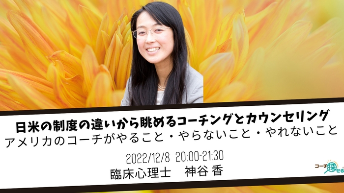 株式会社シェヘラザード(住所:東京都中央区 代表:坂本祐央⼦)は、コーチを無料で探せるプラットフォーム 「コーチ探せる」主催12⽉オンラインセミナー「日米の制度の違いから眺めるコーチングとカウンセリング ~アメリカのコーチがやること・やらないこと・やれないこと~」を2022年12月8日(木) 20時より開催致します。