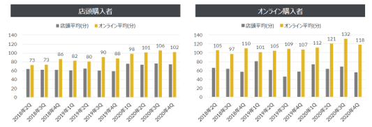 2019年第1四半期から調査をした14カテゴリー全てにおいてオンラインでの購入率が増加をしている。また、購入にいたるオンラインでの検索時間も増加しており、より詳しく商品を調べ購入していることがわかる。