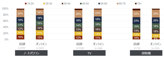 オンライン購入者は若い世代の方が多いと思われているが、店頭・オンラインでの購入者に年齢差はあまりない。商品カテゴリーによってはむしろ若い世代より中高年世代の方がオンライン活用率が高い場合もある。その背景としては、若い世代ではそのカテゴリーの家電製品の購入経験が無く、店頭での説明を重視しており、一方で購入経験がある中高年世代はオンラインでの購入に抵抗が無いという場合が考えられる。