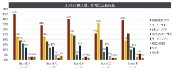 家電製品のオンライン購入者が、購入にあたりどの媒体の情報を参考にしたかという点については、カテゴリ、ブランドにより違いはあるものの、多くの回答者は価格比較サイト、メーカーサイト、レビューサイトを重視する傾向にあることが分かった。