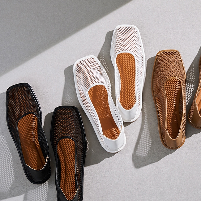 今季トレンドのメッシュ素材を使ったフラットヒールパンプス。
