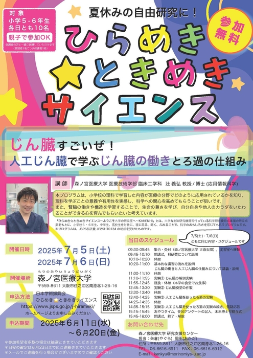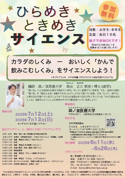 森ノ宮医療大学(学長:青木元邦、大阪市住之江区)は7月5日(土)、6日(日)および7月12日(土)、13日(日)に小学校5・6年生を対象とした「ひらめき☆ときめきサイエンス~ようこそ大学の研究室へ~KAKENHI」を2プログラム開催します。本学は西日本最大級の医療系総合大学として、子どもたちの「科学っておもしろい!」「科学についてもっと知りたい!」という気持ちを引き出し、さらにそこから「医療」を感じていただけるようなプログラムを実施します。