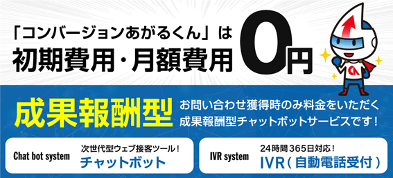 WEBサイトに搭載したかった機能が安価に導入できる!業界初!初期費用0円・成果報酬型チャットボット、自動音声応答システム『CV(コンバージョン)あがるくん』の提供開始。8月-9月分の受付スタート。