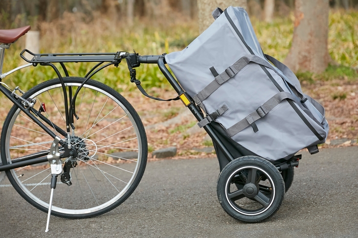 「Camily リヤキャリヤ」は、アウトドアシーンでの使用を想定した頑丈なつくりと、ロードバイクやクロスバイクなどのスポーツ自転車に馴染むシンプルなデザインが特徴です。汎用性の高い構造で、幅広い自転車へ取り付けできます。12インチのエアータイヤを搭載したCamiyサイクルトレーラーは、スポーツ自転車でのけん引でもスムーズに走行可能。荷物をかつぐ必要なく快適にサイクリングを楽しめます。容量約35Lと95Lの専用バッグもあり、バーベキューやレジャー、スポーツや部活、ソロキャンプなどさまざまな荷物に対応します。