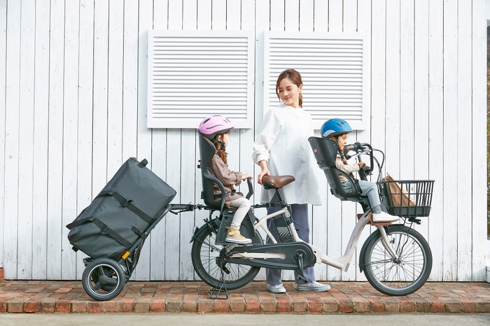 通園や買い物、外遊び時など、子どもを乗せながら大荷物になってしまう機会は少なくありません。そんな危なっかしい場面をなんとかしたいと、自転車用チャイルドシートメーカーのパイオニアとして、約2年をかけて開発したのがCamilyです。容量約95Lの専用コンテナバッグは、通園時に困るお昼寝布団2組を収納可能。荷物をハンドルにかける必要がなくなり、安全なハンドリングと、12インチのエアータイヤでスムーズな走行を実現しました。トレーラーはワンタッチで着脱でき、キャリーカートとしても活躍します。