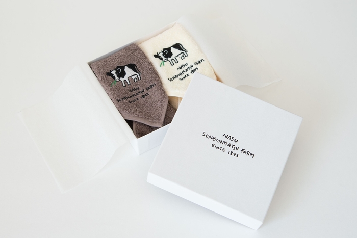 B.(画像左下)那須千本松牧場の放牧場で牛さんたちがくつろぐ様子をプリントしています。
