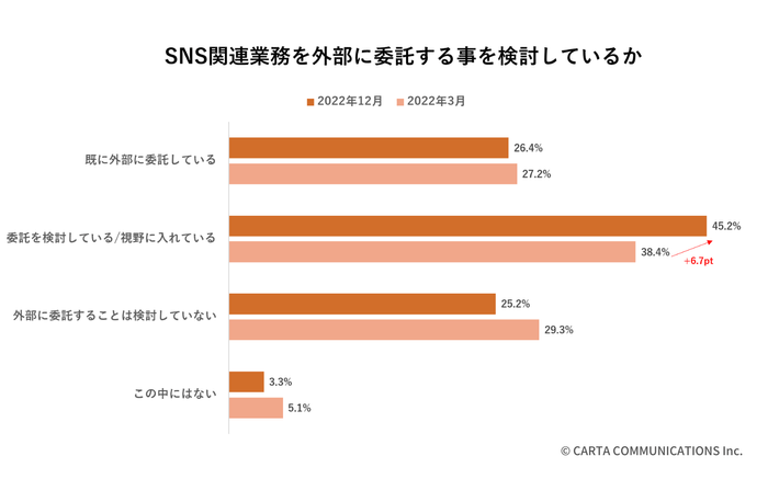 SNS運用にかかわっている方々への質問で、「SNS関連業務の外部委託を検討している」と答えた方の割合は、2022年3月と12月では38.4%から45.2%に増加し、外部委託のニーズが増えている。