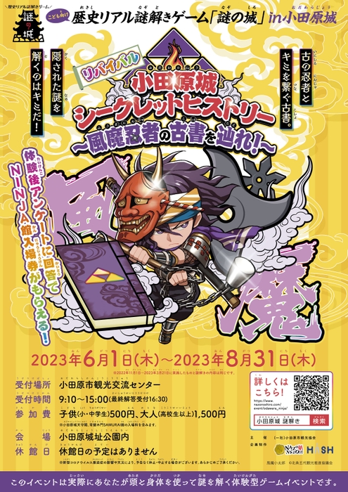 リアル謎解きゲームを使ったプロモーションを提案する株式会社ハレガケ(NAZO×NAZO劇団)(本社:東京都豊島区、代表:黒田洋介)は、株式会社マッシュ(所在地:大阪府大阪市)と共同企画で、こども向け歴史リアル謎解きゲーム「謎の城」in小田原城「小田原城シークレットヒストリー〜風魔忍者の古書を辿れ〜」を2023年6月1日(木)から2023年8月31日(木)までリバイバルします。2022年から2023年にかけて開催した際、お子様連れの多くのファミリー層にご来場いただき大変好評だったため、この度リバイバルの開催を決定しました。