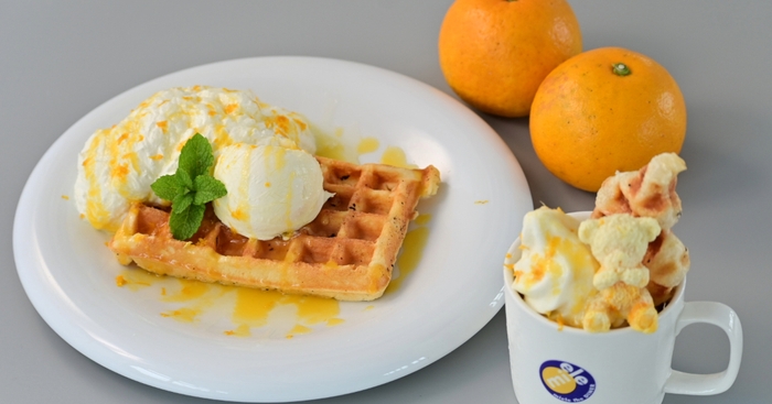 「miele the DINER」の2階カフェでは、アツアツ焼きたてワッフルに、バニラアイスと淡路島なるとオレンジの果汁を含ませた特製エスプーマをトッピングし、味のアクセントとして淡路島なるとオレンジのソースをかけた『淡路島なるとオレンジのワッフル』や、淡路島牛乳の濃厚でまろやかな甘みを持つソフトクリームと爽やかで独特の苦みがある淡路島なるとオレンジをかけ合わせた『淡路島なるとオレンジのDINER’S SANDAE』を提供。白×オレンジのくまちゃんチョコレートのトッピングは『淡路島なるとオレンジのDINER’S SANDAE』を、ご注文のお客様限定でお楽しみいただけます。