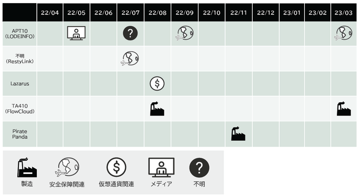 2022年度は、2021年度の観測から継続してAPT10攻撃グループのLODEINFOマルウェアを使った攻撃がこれまで同様にメディアや安全保障関連といった業種で活発に観測されました。LODEINFOマルウェアを使った攻撃では、配送されるファイルがOfficeのマクロファイルに加えてVHD形式のディスクイメージファイルが使われた事や、DLLサイドローディングに利用する正規実行ファイルの変更、ローダDLLの難読化といった変化が確認されました。これらと比べると、メモリ上のペイロードであるLODEINFO本体は若干のアップデートにとどまっていました。また、以前から継続した攻撃キャンペーンの一環と思われる攻撃として、Lazarus攻撃グループの仮想通貨関連組織を標的としたショートカットファイルをダウンロードのコマンドとして悪用する攻撃が観測されています。この観測については、2019年頃に報告された手法とほとんど変化がありませんでした。2022年度から新しく観測された攻撃として、Operation RestyLink、EneLink、Earth Yako攻撃グループによる攻撃キャンペーンを安全保障関連の組織で観測しました。また、2022年度から新たに観測された攻撃として、TA410攻撃グループによるFlowCloudマルウェアを使った攻撃、Pirate Panda(別名 Tropic Trooper、GouShe)の攻撃が観測されました。この2つの攻撃キャンペーンは、国内の製造業種の中国拠点での観測でした。これら攻撃の観測について、FlowCloudマルウェアがUSBメモリからの感染であった点を除いて、スピアフィッシングメールやチャットツールの添付ファイルが主な感染経路となっていました。2021年度までは、A41APT攻撃キャンペーンのようにVPN装置といった公開システムの脆弱性をついて侵入する攻撃が見られましたが、2022年度の特徴としては公開システムからの侵入事案が減少した観測となりました。