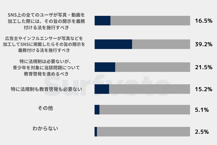 最も多かった回答は「広告主やインフルエンサーが写真などを加工してSNSに掲載したらその旨の開示を義務付ける法を施行すべき」39.2%。次いで、「青少年を対象に教育啓発を進めるべき」21.5%。