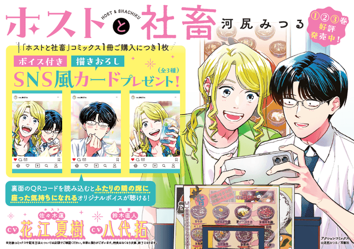 新刊発売を記念して描き下ろしSNS風イラストカード【全3種】をご用意!全国の「『ホストと社畜』応援書店様」で配布いたします!カード裏のQRコードを読み込むと、“ふたりの隣の席に座った気持ちになれる”オリジナルボイスが聴ける豪華仕様です!キャストはもちろんミニアニメと同様、花江夏樹さんと八代拓さん。どんな会話が交わされているのか、ぜひチェックしてみてください!