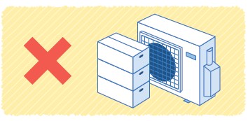 空気の熱を集める室外機にとって空気の通り道は大切です。室外機周辺に障害物があり、吸込口や吹出口がふさがれてしまうと、熱を効率的に集めることができず、無駄な電力消費につながります。障害物がない場合も、冬は室外機の周りに雪が積もって、吸込口、吹出口をふさいでしまうこともあります。室外機の周辺はすっきりと余計なものは置かず、障害物は取り除くようにしましょう。