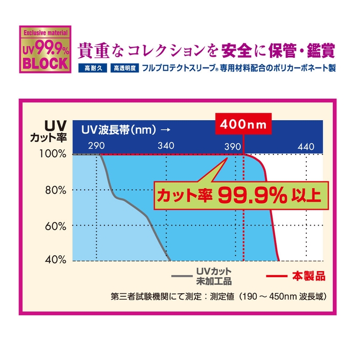 フルプロテクトスリーブ®専用材料配合のポリカーボネートを使用し、紫外線最大波長帯400nmまでを99.9%ブロック。色褪せの原因になる紫外線から大切なコレクションを保護します。