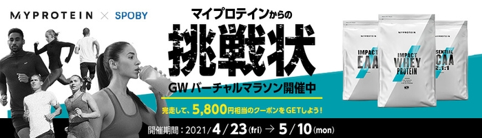 今回のキャンペーンでは5kmのマラソンに、アプリを通じてウォーキングやランニングに取り組んでいただく事で健康を促しつつ、疲れた体にプロテインが補給いただけるよう、高品質で豊富なフレーバーを取り揃えているマイプロテインから特別優待券をご提供いただける事となりタイアップが実現いたしました。SPOBY(スポビー)とマイプロテインは、普段の生活にウォーキングやランニングとプロテインを取り入れる、新しい健康習慣をご提案いたします。
