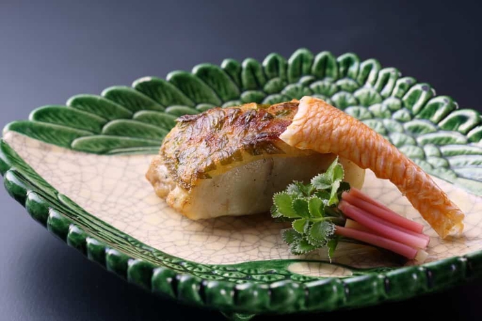 ほどよく脂の乗った甘鯛に白味噌とバターを合わせ焼き上げました。木の芽の香りが爽やかさを加える一品です。さっぱりと仕立てた浜防風の甘酢漬けと食感の良い鱗(うろこ)揚げを添えています。