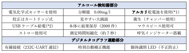 従来の機能は踏襲しつつ、様々なメーカーのデジタルタコグラフと連動し、アルコール測定結果を送信、保存管理ができる製品となっております。