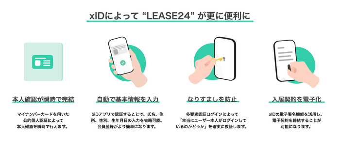 今回の提携によって、LEASE24への会員登録の際の基本情報の入力、同サービスのウェブサイトへのログイン、入居の際の賃貸契約締結の3プロセスそれぞれにxIDのAPI機能が実装されます。