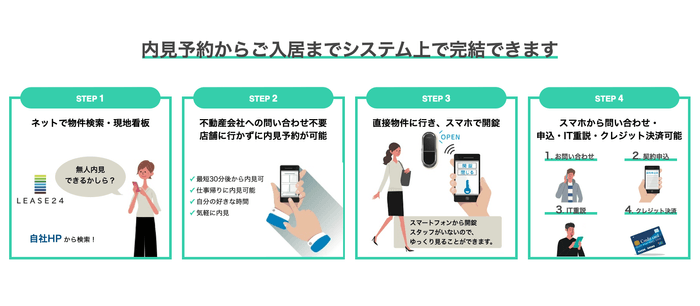 ○ マンションオーナーとユーザーが直接繋がるマッチングサイトです。ユーザーがポータルサイトLEASE24で探した賃貸物件に直接不動産業者無しで向かい、スマートロックの鍵を開錠し入室し内覧、気に入ったら申込みから契約、入居までを不動産業者に出向くことなく、自由な時間において内覧から申込みが出来るシステムです。