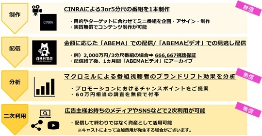 本プロダクトは、「CINRA」にて企画した3分~5分尺のオリジナルミニ番組を、テレビ&ビデオエンターテインメント「ABEMA(アベマ)」の編成番組枠とCM枠にて配信します。カルチャー系や若年層に強みを持つCINRAの高い企画・制作力、唯一無二の動画配信サービス「ABEMA」の独自の企画・制作力および高い集客・話題化力、CCIの販売力を集結することで、企業は配信ターゲットとなる視聴者に対して、質の高いマーケティング効果が期待できます。