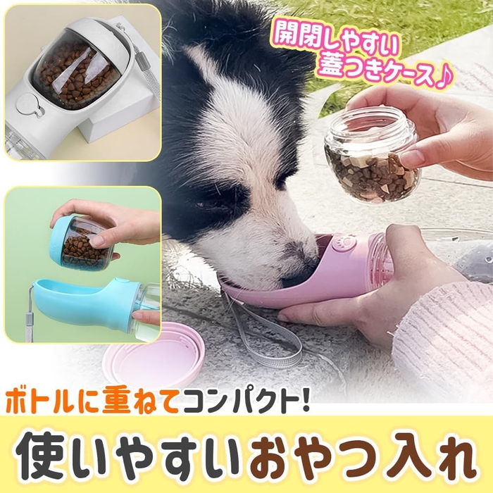このウォーターボトルはただ水を持ち運ぶだけでなく、おやつ入れも格納して持ち歩けるのが特徴です。水分補給と同時に、お散歩や外出時にペットのお気に入りのスナックを簡単に携帯する事ができる仕様です。
