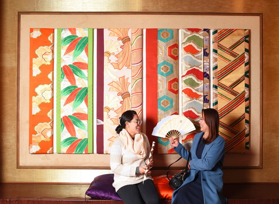 10枚のヴィンテージ帯を使い、6枚のオリジナル帯パネルを製作。お客様が座布団に座って和傘や扇子などの小道具を持ち、日本に来たことを思い出に残せるフォトスポットにもなっています。また、どの角度から撮っても背景が美しく、写真映えするように設計しています。