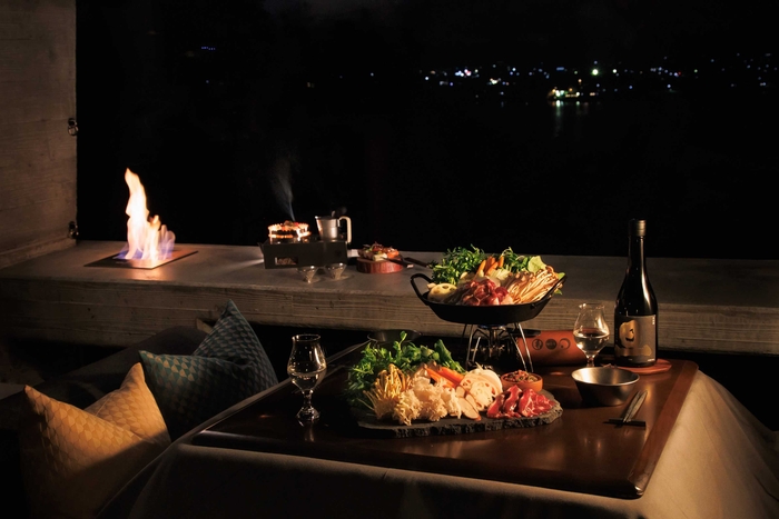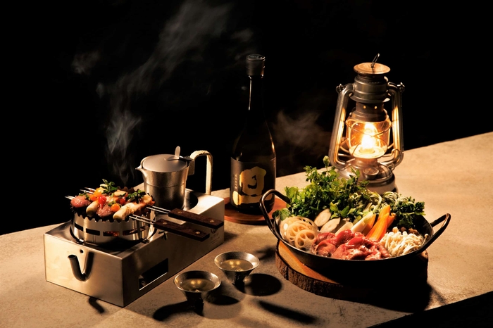 本プログラム限定の食事をキャビンで提供します。2日目の朝食は、日本酒づくりに使用される酒米で作る甘酒粥をメインとした和朝食です。夕食には、猪肉や季節の野菜に、甘酒と豆乳を使った出汁を合わせた「甘酒ぼたん鍋」と、料理の味わいに合わせた日本酒を用意します。グランピングマスターのサポートのもと、「野燗炉(のかんろ)」と呼ばれる、屋外で燗を楽しむ際に使用する調理器具で串焼きを仕上げ、日本酒を好みの温度に温めて味わいます。食事を通じて、日本酒の原材料や温度による味わいの変化について、楽しみながら学べます。