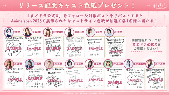 2025年3月22日(土)・23日(日)東京ビッグサイトで開催されたAnimeJapan2025「魔法少女まどか☆マギカ」ブースにて展示されていたキャスト陣のサイン色紙をプレゼントいたします!