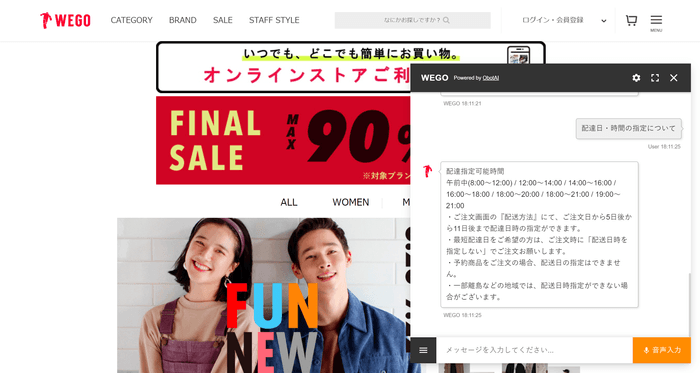そして今回、さらに「あなたのファン」であり続ける事を目的にさらなる顧客満足度の向上を目指す一環として、「WEGO」公式オンラインショップにAIチャットボット ObotAIを導入いたしました。お客様からのお問い合わせに即座に回答できるAIチャットボットを設置することにより、利便性の高いスムーズな顧客対応を実現いたします。