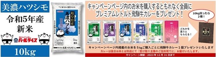 2. 内容:対象商品をご購入の方全員に、5kgご購入ごとに飛騨牛カレーを1個プレゼント
