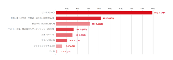 今年、スーツ着用の機会を増やしたいと回答した人は意外にもビジネスシーンでもっと着用したいという気持ちが強い。また、コロナ下の影響で自由に外出することが困難だったことから、スーツを着用してお祝い事や、飲食店へ行きたいという声が多くみられる。